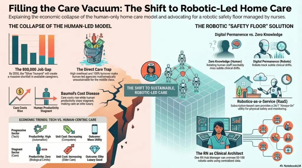 By: Jude Chartier, RN / AI Nurse Hub Date: March 7, 2026 Abstract The American home care industry is currently navigating a state of terminal economic failure. Traditional discourse often frames the rise of humanoid robotics as a threat to human employment; however, a rigorous analysis of labor data and economic theory reveals a “Care […]