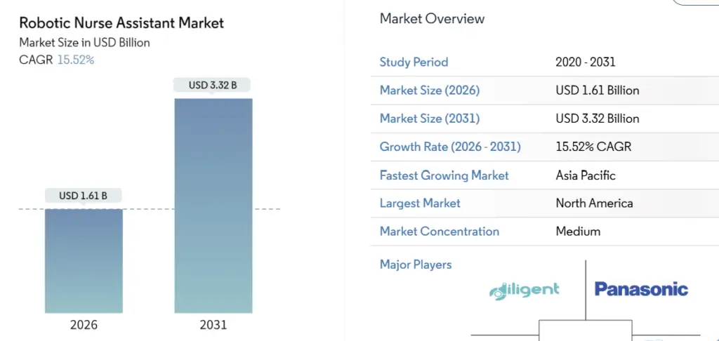 The robotic nurse assistant market is expected to grow from USD 1.39 billion in 2025 to 1.61 billion in 2026 and forecast to reach 3.32 USD billion by 2031. Demand is escalating as health systems confront a widening nurse staffing shortage. https://www.mordorintelligence.com/industry-reports/robotic-nurse-assistant-market