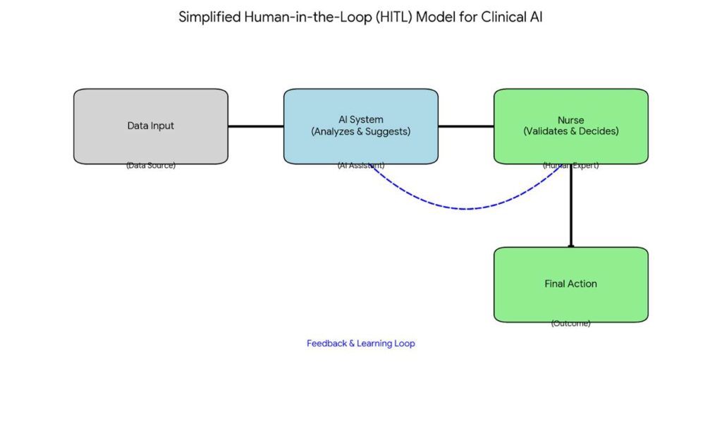 A common fear is that AI will replace nurses. This is a misconception. The scholarly and practical consensus supports a “Human-in-the-Loop” model. In this framework, AI systems are designed to augment, not replace, human expertise.